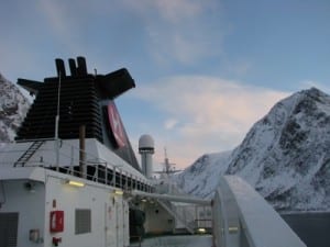 The MS Polarlys is not your typical cruise ship, but a working ship. Built in 1996, it’s stylishly furnished with mahogany paneling, polished brass and Norwegian contemporary art. Its 482 berths are compact and cozy, with no TV’s, although the Nature Channel is right outdoors. Other amenities include a small workout room, 24-hour cafeteria and an Internet Café. And of course lounges and dining rooms, with no shortage of tasty food on board. The ship holds 50 cars and plenty of cargo, and drops off and picks up goods along the route. In the “old days,” it took three weeks to go from Hammerfest to Bergen. Now it only takes three days.