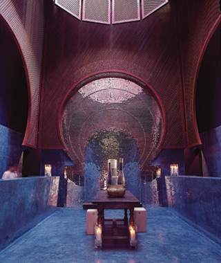 “Moorish and South Asian influences are evident in the interior, with iron lanterns, sturdy geometrical shapes and dark-hued textiles and carvings – the dramatic, blue concierge desk, right, is particularly impressive. But for us, the high design is at its best in the bathrooms, where Spanish tiling, lovely slabs of marble and fine charcoal-grey stone are put to use in just about every imaginable way of bathing: plunge pools, outdoor rain showers and indoor Turkish baths. The clove-scented local curries are the star dishes at the restaurant and we love the crystal stone massage available at the spa.