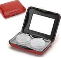 No more drab plastic. Our EMBOSSED GENUINE LEATHER, SNAP CLOSE TRAVEL CASE incl a leakproof plastic holder for your contacts plus a mirror so you can see what you’re doing! Clearly marked left & right sides open together or separately. Measures 3â€? x 2â€? x 1 3/4â€? closed. Comes in striking lizard red, hazlenut brown and sophisticated grey. Get a different color for each member of the family. Only $13.50 plus FREE S&H.