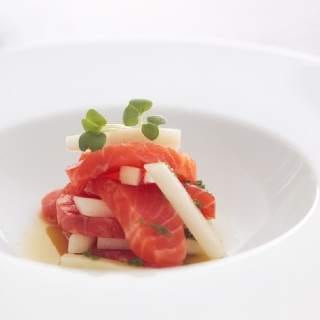 • Salt –pressed Tasmanian Trout with asian pear and daikon sprouts, and a citrusy Kalamansi Dressing.