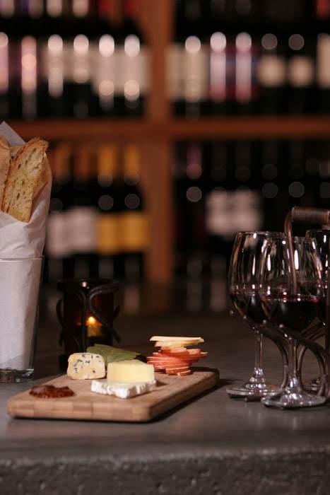 My husband and I popped into what was formerly a branch of University Bookstore. The volumes have been replaced by vino, bottles and bottles of vino. The decor, described as “casual sophistication with an upbeat metropolitan style,” is dark and seductive. Almost Spanish-Gothic in feel. Wrought iron bar stools along with matching chairs and tables are set against a backdrop of distressed brick walls, a cool concrete bar and 20-ft. floor to ceiling windows looking out onto the streets. Chandeliers and votive candles give it a warm glow when night falls.